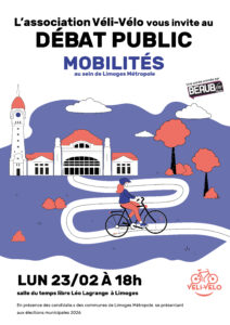 L’association Véli-Vélo présentera les résultats du Baromètre vélo 20225, le projet REVEL et l’accessibilité au sein de Limoges Métropole. Nous interrogerons les candidat.e.s aux élections municipales sur leur volonté de soutenir ces projets et sur la manière dont ils les mettraient en place. Un temps d’échange avec le public est prévu.