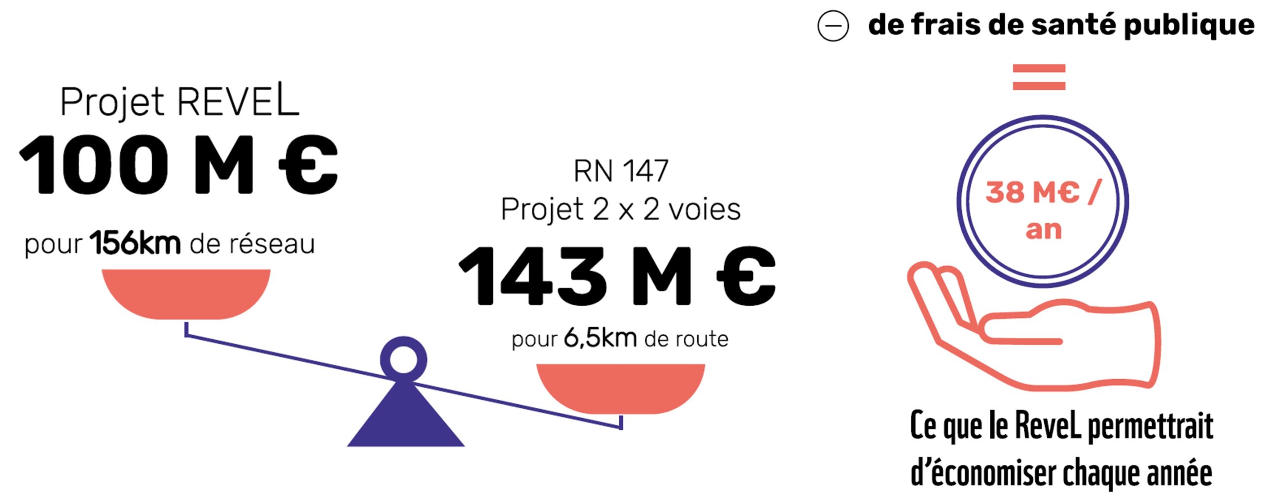 À titre de comparaison, ce montant est inférieur à celui de la création de la 2×2 voies de la RN147 entre Couzeix et Nieul (132 M€ pour 6,5 km et 1 minute gagnée). Bien que cette route ne relève pas de son domaine routier, Limoges Métropole y contribue à hauteur de 10,5 millions d’euros.