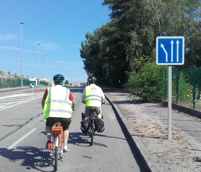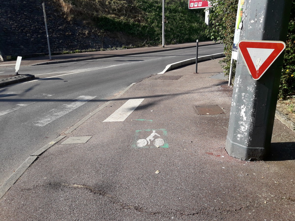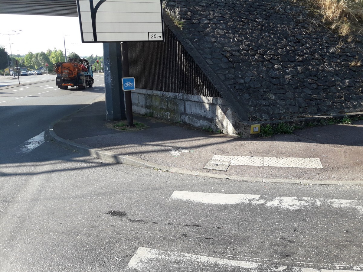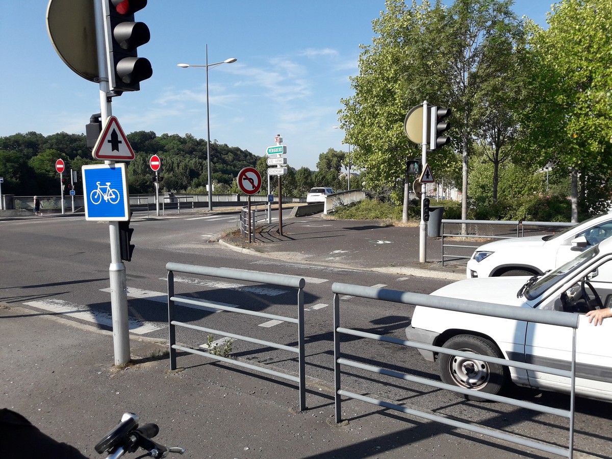 Le vélo a été le grand oublié de cette zone… Du coup, on l’a mis sur les trottoirs parfois de largeur insuffisante (les piétons n’ont pas été bien considérés non plus…) avec une signalétique défaillante. Si on se fie à son instinct, on se retrouve sur le trottoir droit du nouveau pont qui est sans issue…