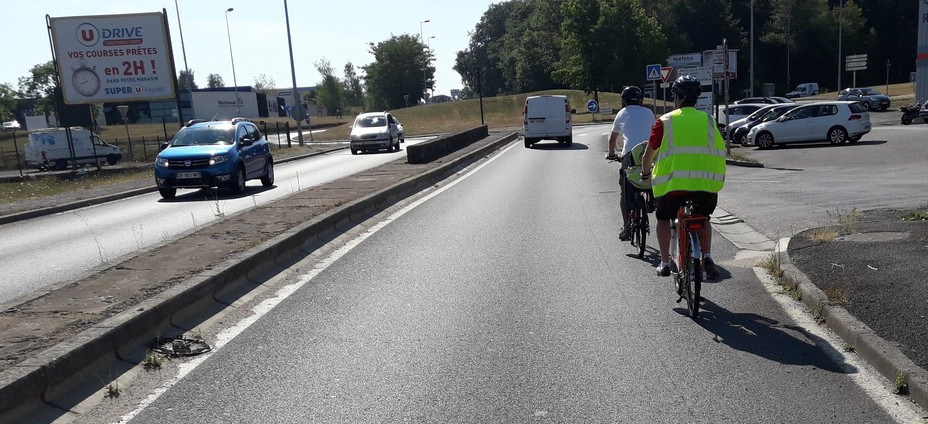 Tout a été pensé pour canaliser les automobiles (doubles voies, terre-pleins centraux) et le vélo est là comme un chien dans un jeu de quilles… Pourtant il n’existe pas d’alternatives pour rejoindre Feytiat depuis Limoges, comme le fait tous les jours un bien courageux homme en bleu!