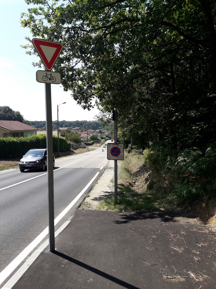 Record d’étroitesse pour une bande en descente et terminaison dangereuse et non conforme, alors qu’il y a de l’espace. Les marquages commençant à disparaître, il sera judicieux de supprimer la bande en descente et d’élargir celle dans le sens montant.