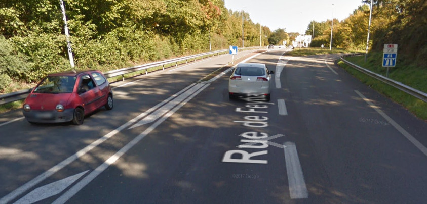 Dommage que cette voie rénovée récemment ait été dimensionnée à l’américaine sans le moindre aménagement cyclable, alors que le trafic est peu dense. Pourtant il y a la place, la vitesse est limitée à 50km/h et on est dans le prolongement de l’avenue Georges Pompidou où se trouvent les seules voies de bus ouvertes aux vélos… Au lieu de ça, 4 voies automobiles et un terre-plein central, l’enfer du vélo !